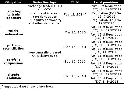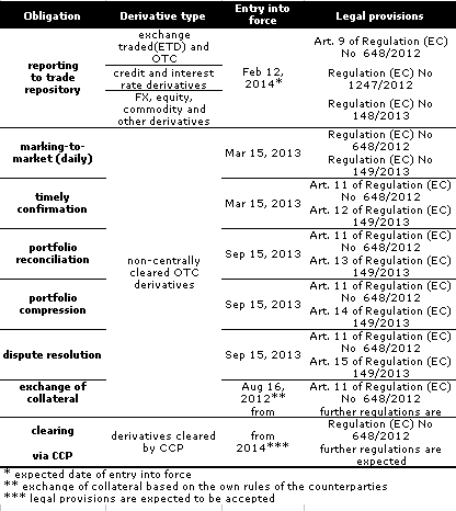 - Reporting to trade repository: Regulations (see below) provide standard forms that to be filled in and submitted to a trade repository. (Trade repositories are expected to be registered in H2 2013). Reporting covers not only those derivatives that are entered into by the counterparties in the future but those ones that were entered into in the past (even before Aug 16, 2012) if the deals meet the criteria set out by relevant regulations (see Regulation (EC) No 648/2012, 1247/2012 and 148/2013). The deadlines for these reports are also set out by these regulations.